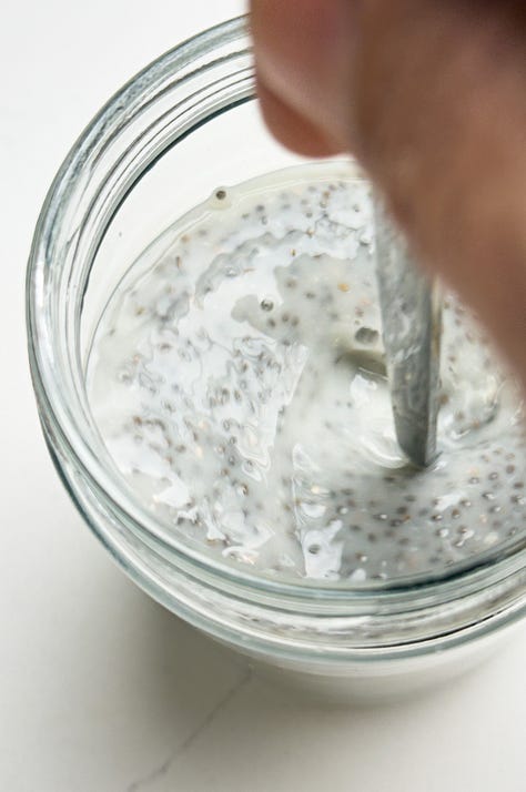 Sprinkle in the chia seeds gradually while whisking. Switch to a spatula and stir thoroughly, scraping the sides and bottom to make sure the seeds are evenly distributed. Let stand for 10 minutes, then stir again. Repeat this two to three times as the mixture begins to thicken.