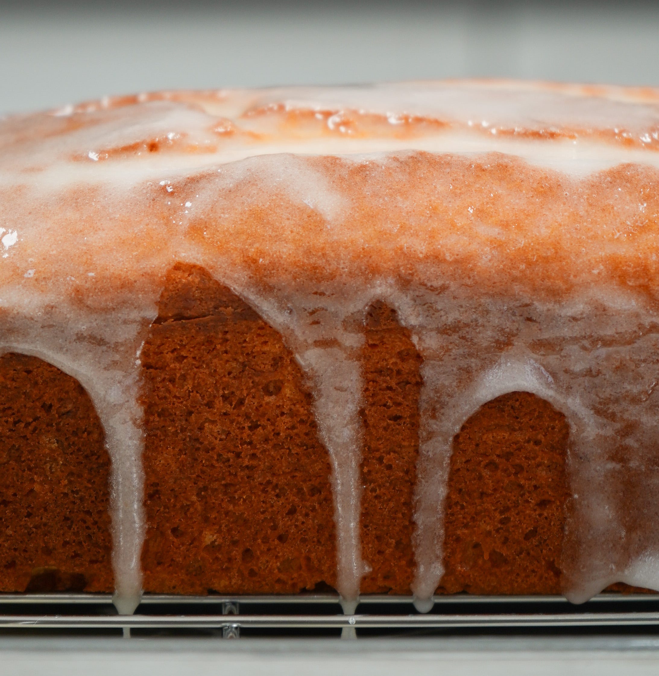 Once the cake is fully cool, place it on a rack with parchment underneath. Pour the glaze down the center, letting it settle and drip naturally over the sides. You can gently tilt the cake to help it spread.