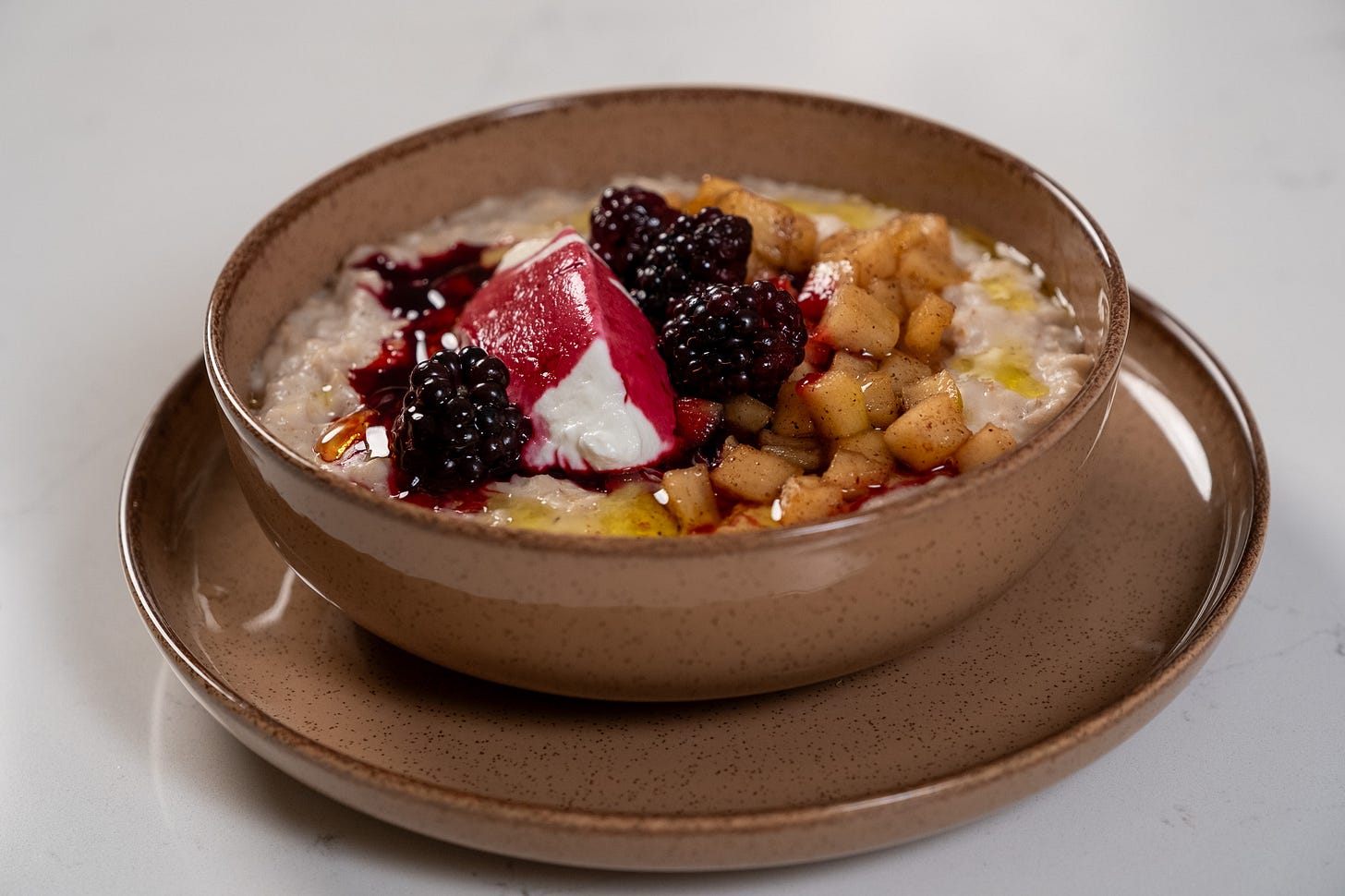 Oatmeal is a blank canvas. You can make it rich with full milk, lighter with half milk and half water, or dairy-free with almond milk. It takes on whatever tone you give it. Here, the apples bring warmth, the berries keep it alive.