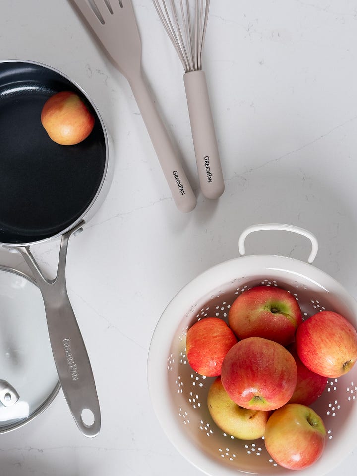 Melt the butter in a medium sauté pan over medium heat. Add the apple cubes, date syrup, cinnamon, and a pinch of salt. Cover and cook 4–5 minutes, tossing occasionally, until the apples soften slightly and take on a light caramel glaze. Scoop out the apples and set aside.