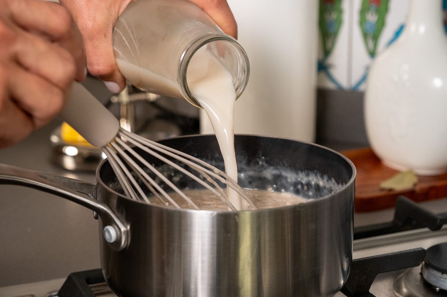 Add the oats, milk, salt, lemon peel, and date syrup directly to the same pan. Bring to a gentle simmer and cook 10–12 minutes, stirring often, until creamy but still textured. Remove the lemon peel.