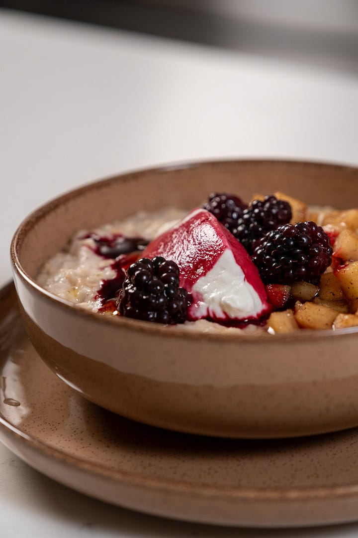 A calm bowl for early autumn mornings. Warm buttered apples, creamy oats, and glossy blackberries.