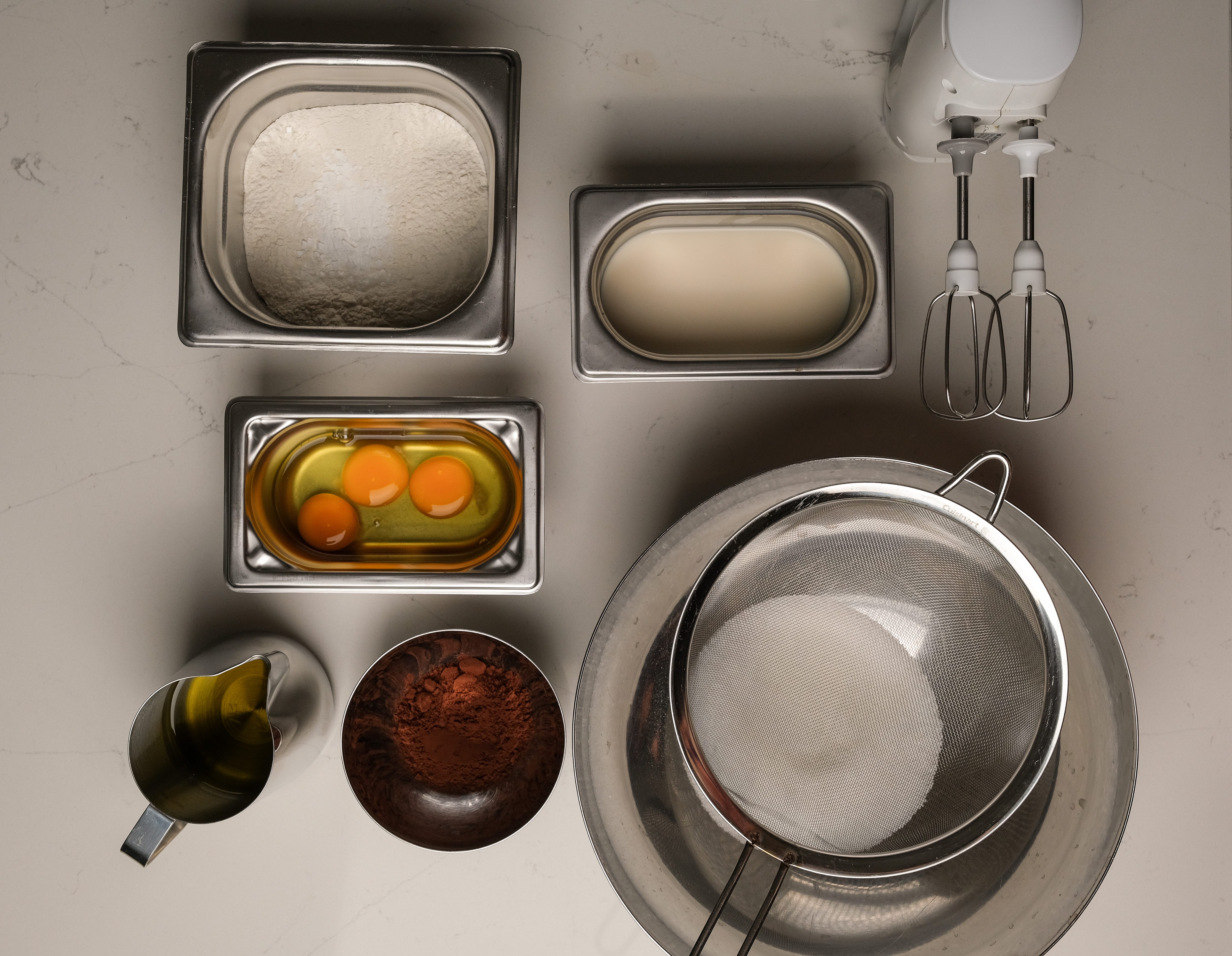 Transfer 450 g of the batter to a separate bowl. Bloom the cocoa powder with hot milk and hot water (60–70°C) until smooth. Stir into the reserved batter until fully incorporated.