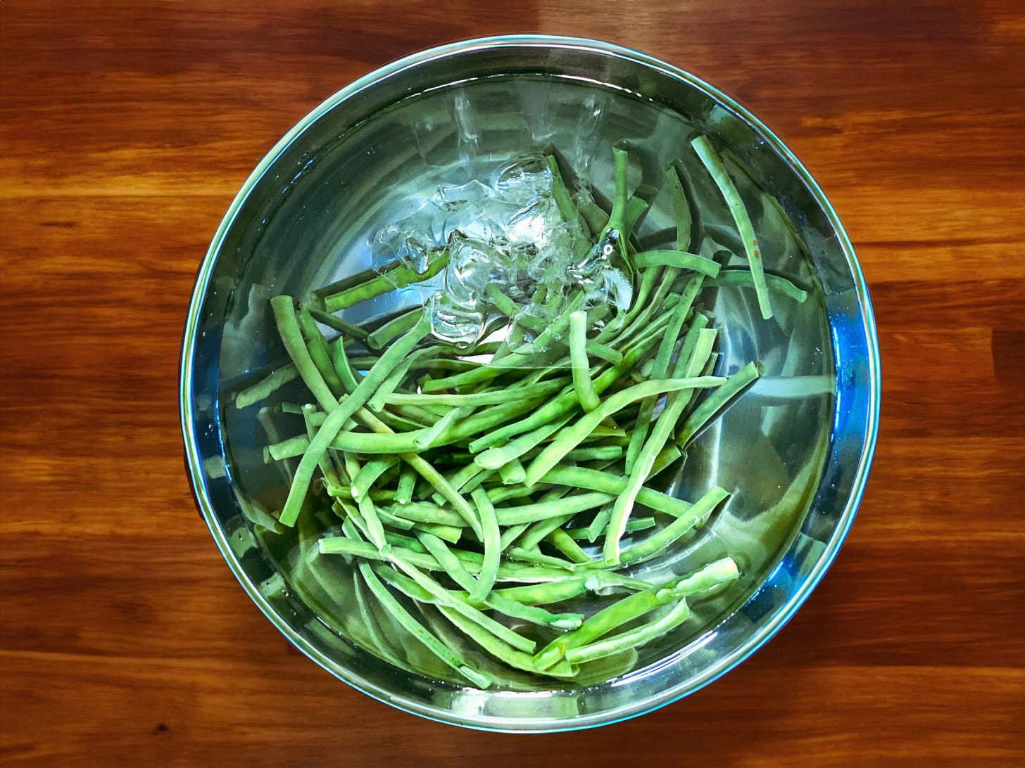 Bring a pot of salted water to a boil. Add the beans and cook until just tender, about 5–6 minutes. Transfer immediately to an ice bath to lock in color and stop the cooking. Drain well and pat dry.