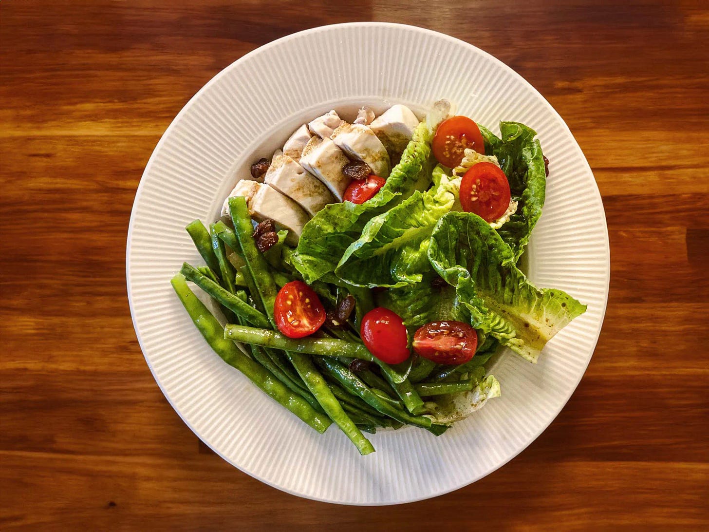 Arrange the beans, sliced chicken, and romaine on plates. Add halved tomatoes, jammy eggs, and softened raisins. Drizzle with more vinaigrette to finish.