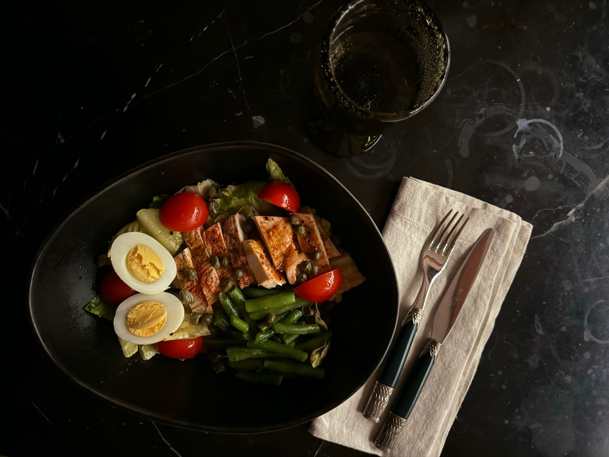 There’s a quiet kind of satisfaction in pulling together a salad like this. It’s soft and crisp, warm and cool, with just enough contrast to keep things interesting. Poached chicken, green beans, jammy eggs, a few good leaves—and a vinaigrette that does the real work.