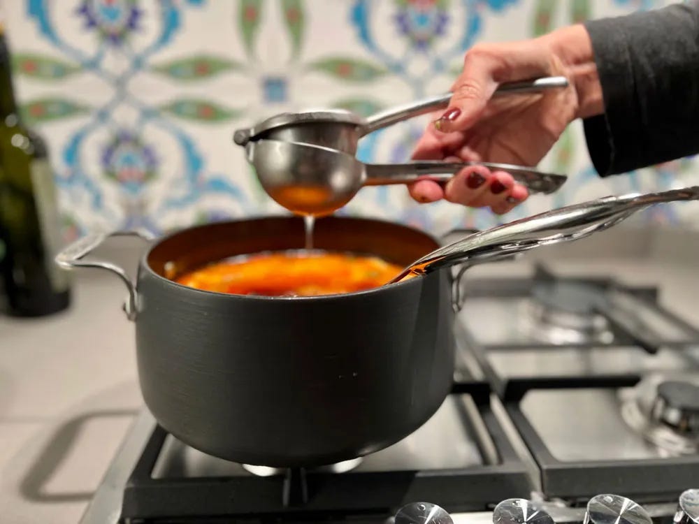 Etleri bir kenara alın, suyunu süzün. Eğer tam anlamıyla berrak bir su istiyorsanız, bir tülbentten geçirerek süzmeyi deneyin. Küçük bir detay ama çorbanın son dokusunu fark edilir şekilde etkiliyor.