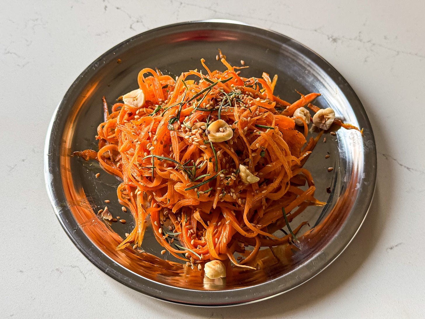 Just carrots—shaved into ribbons, gently softened with olive oil and cumin—topped with toasted hazelnuts, sesame, and rosemary. Earthy, slightly sweet, deeply satisfying.