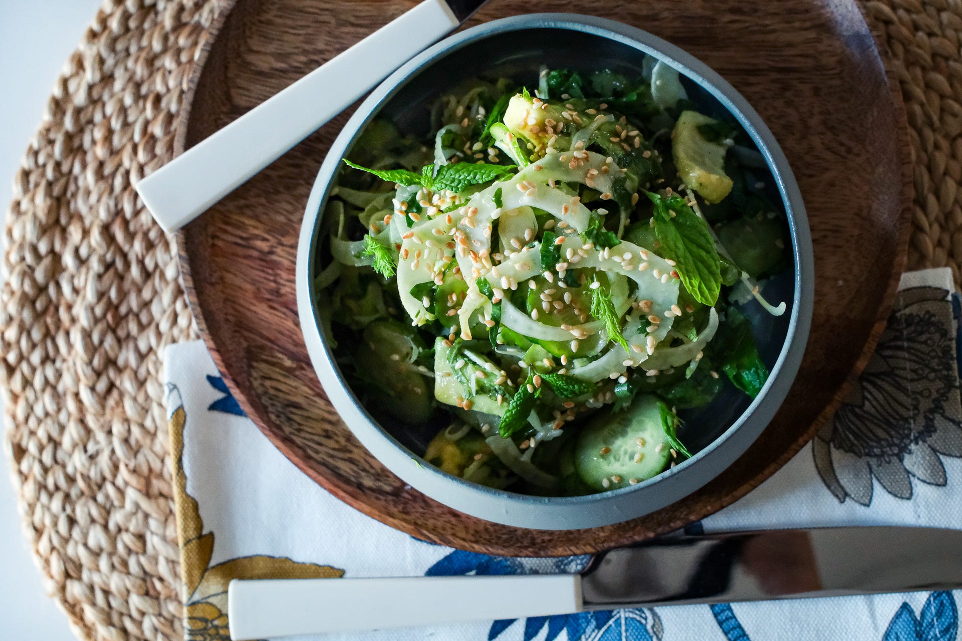 This salad leans into that: the clean crunch of fennel, the creaminess of avocado, the coolness of cucumber. A balance of textures, finished with herbs and a citrusy sesame dressing that ties it all together.
