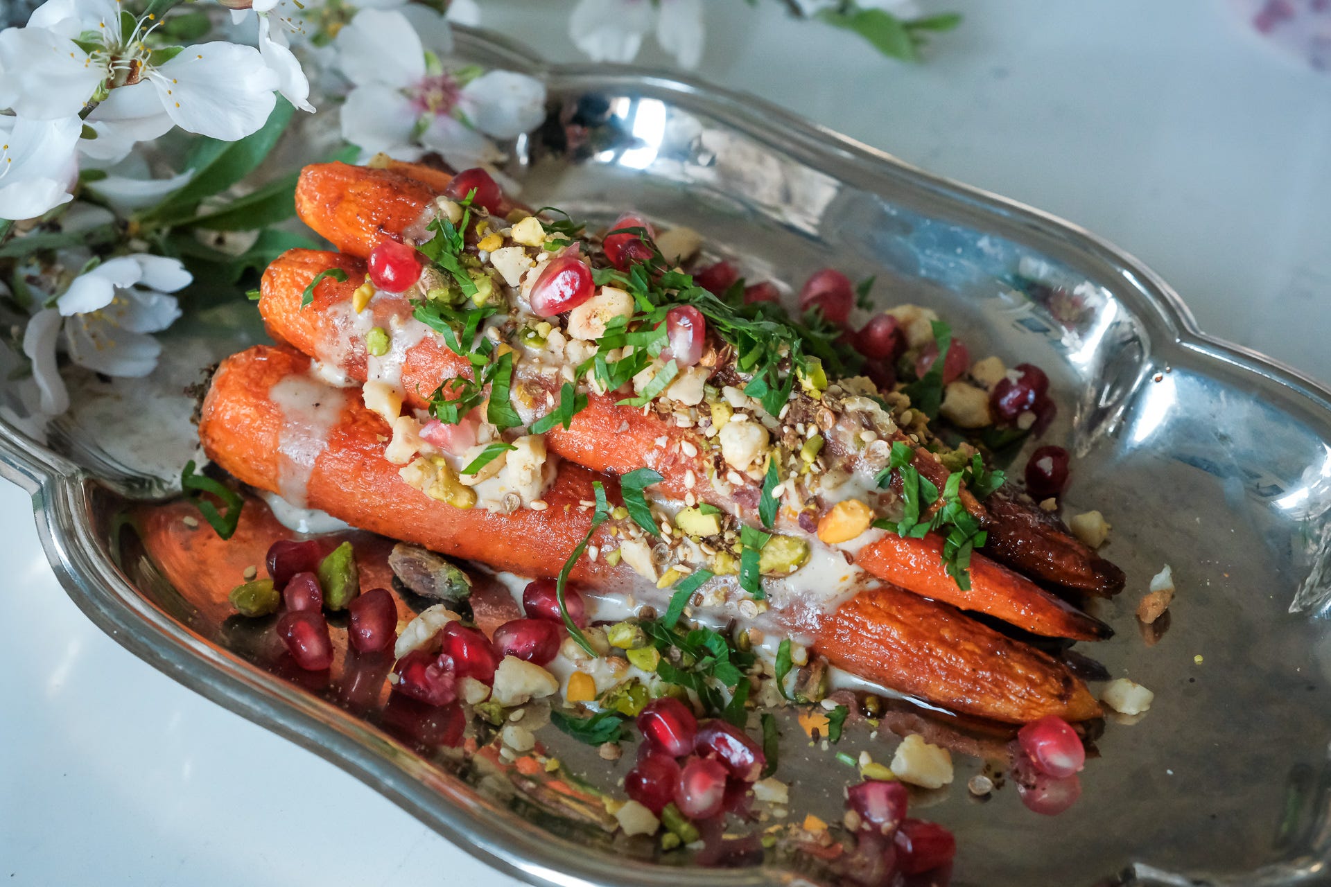 Fırından çıkan havuçları servis tabağına alın. Üzerine tahin sosunu gezdirin. Fıstıklı baharat karışımını bolca serpiştirin. Nar taneleri ve taze otlarla süsleyin. Ilık ya da sıcak servis edin.